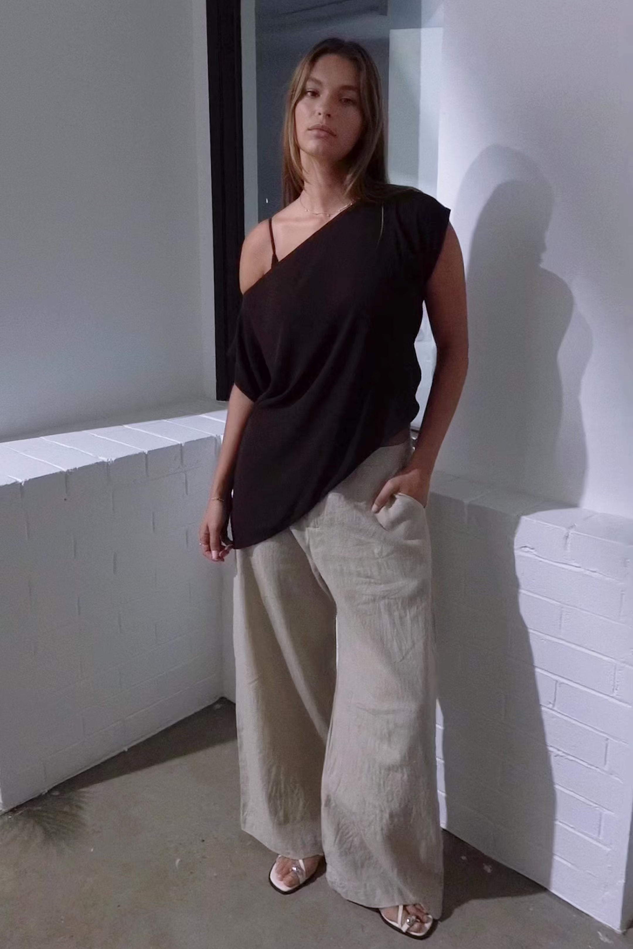 Essential Trouser in linen with wide-leg relaxed silhouette, dual button closure, and matching Linen Halter Top, styled for coastal lunches and resort wear.