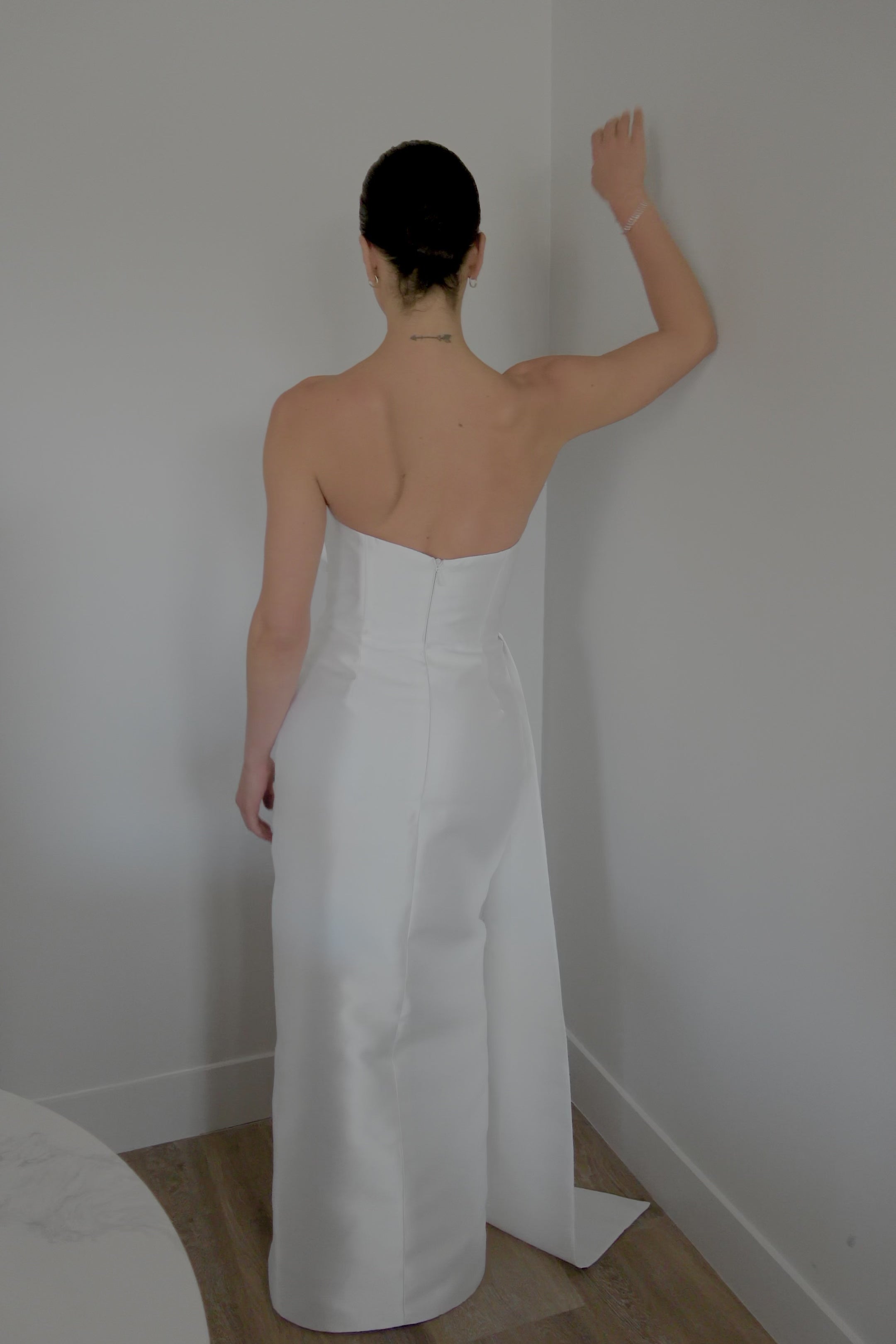 The Nebula Dress features a removable, handmade rose and drape, offering the versatility of two dresses in one. It also includes a lining, a concealed zipper, and a boned bodice for a structured fit.