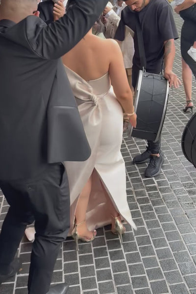 Crafted from our signature heavyweight satin, the gown features a sculpted pencil skirt and a double-layered drape that falls into a soft knot at the back, adding depth and movement. Every seam is carefully placed to contour the body, creating a flawless, statuesque fit.